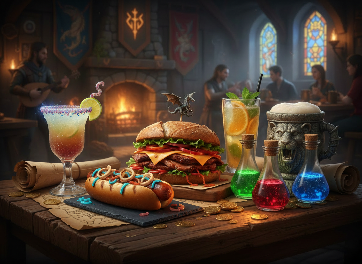 V naší krčmě nenajdete královské hostiny ani dračí pečínky, ale poctivá a sytá jídla, která spolehlivě doplní síly každého hrdiny u herního stolu. Dopřejte si hotdogy, křupavé toasty, panini a další slané pochoutky, ideální na dlouhé partie, nečekané zvraty i vítězné tahy.